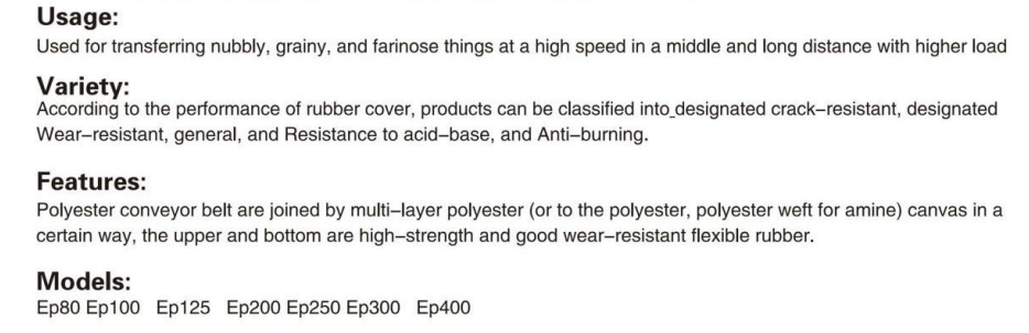 Polyester conveyor belts offer high tensile strength, low elongation, and excellent resistance to acid, alkali, and heat. They are widely applied in cement plants, chemical industries, and mining sectors. Built for durability and structural integrity, these belts provide reliable performance and a long service life under harsh industrial environments.